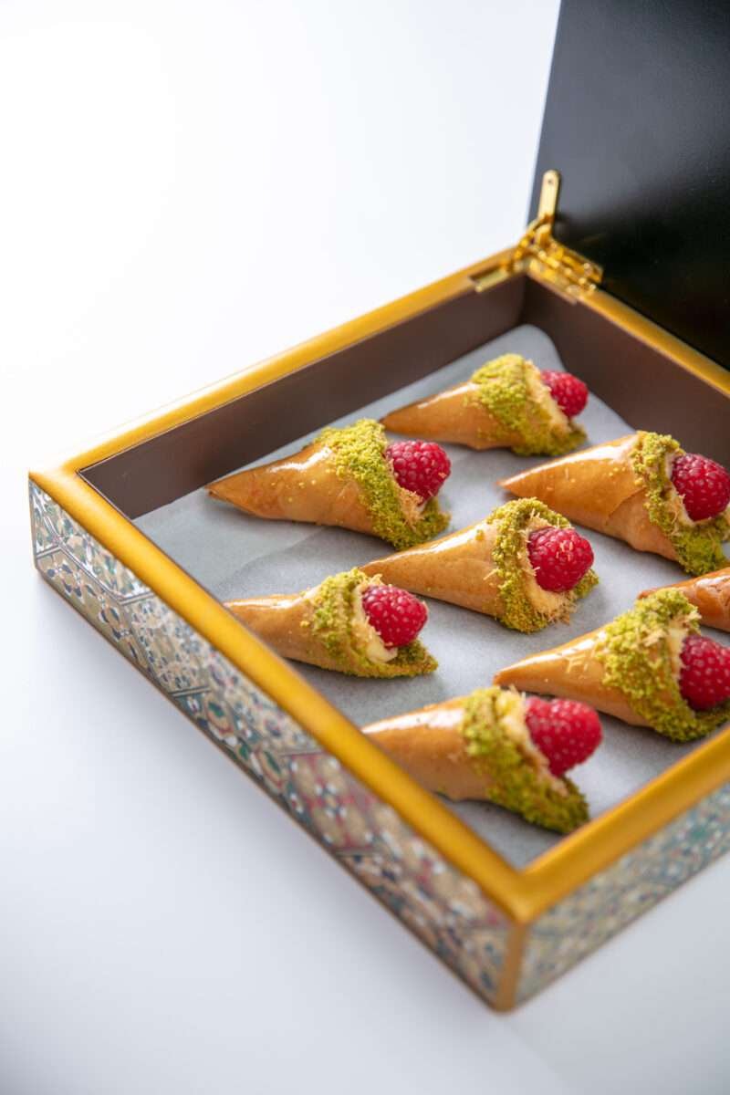 Experience the perfect balance of crispy, flaky layers of golden phyllo pastry, generously filled with a rich blend of crushed nuts and sweet, tangy raspberries, then drizzled with a delicate honey syrup. This unique take on traditional baklava offers a burst of fruity freshness in every bite, making it an irresistible treat for dessert lovers.